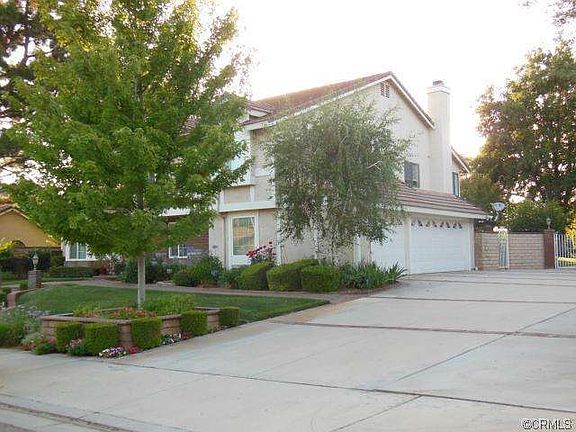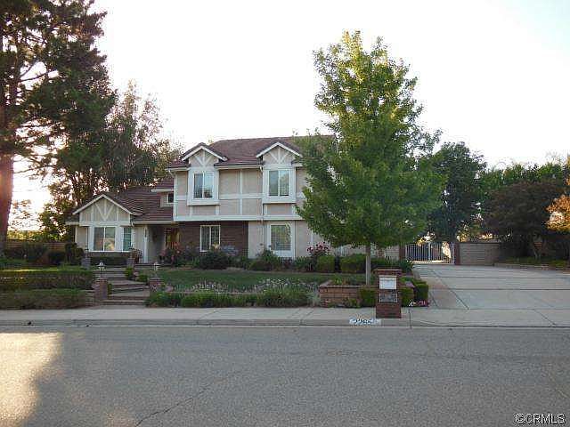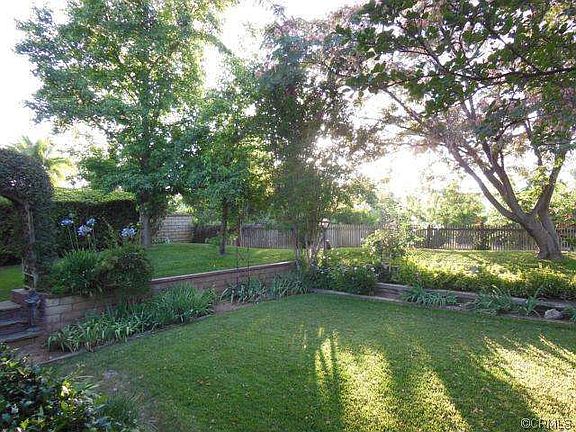 Beautiful Hawarden Estates popular plan home on spacious grounds, private lot, secluded neighborhood features 5 bedroom and 3 baths, travertine flooring, crown molding and tranquil backyard. one bedroom and bath located downstairs perfect for guests or in-law suite. Volume ceilings in the L/R w/ crown moldings, dining room has sliding door to rear grounds w/ separate patio wrapping around to main patio. Kitchen upgraded w SS appliances, granite counters, walk in pantry & travertine floors extending to family room & wrapping to front entry. Newer windows and slider are just one of the many features of this home. Family room is open to kitchen and spacious which also features a fireplace, sliding door leading to an incredible rear grounds which has a sunken garden, mature trees, beautiful and peaceful patio sitting area w/ patio cover. Backyard extends from a manicured landscape to a grit orchard w/ apricot, avocado, apple peach and more. Oversized driveway enters to 3 car garage and extends past wrought iron gates to RV pad. Upstairs features 4 generous size bedrooms including master suite. Master features a walk in closet, soaking tub and large dressing area. 4th upper bedroom is oversized & can be used as a bonus / game room.