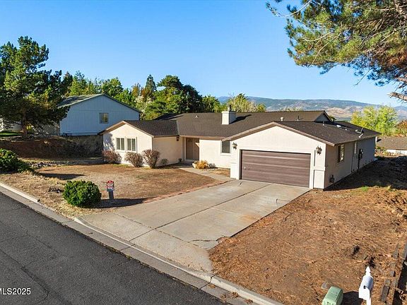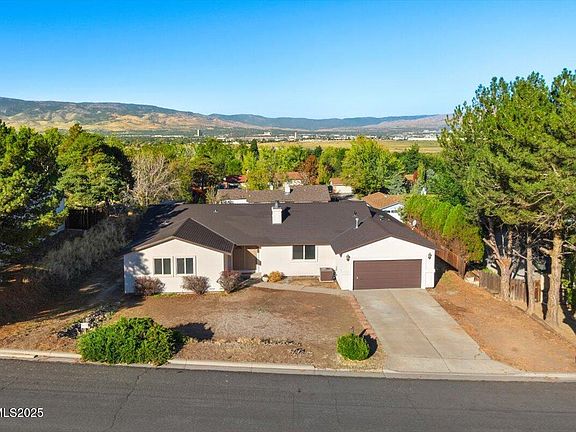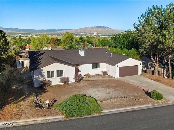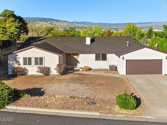 Enjoy breathtaking city, valley, and Sierra Mountain Range views from this spacious Hidden Valley Highlands home. Originally built in 1978, the property underwent a major remodel and addition in approximately 2005, which included a new roof, expanded bonus room, and a beautifully updated primary suite and bath. The kitchen was completely remodeled, featuring ample counter space and a large island, complemented by a cozy wood-burning fireplace nearby. Additional improvements included updated heating and cooling systems, a stucco exterior, and dual-pane vinyl windows (majority) for efficiency and comfort. The interior has been freshly painted and features new carpeting, creating a bright and inviting atmosphere throughout. The primary suite offers a relaxing jetted garden tub, while the bonus room provides flexible space for hobbies or an office. Set on a 0.34-acre lot, the property includes a rear storage shed, a two-car garage, and side area suitable for RV or trailer parking. The site offers a clean slate for your landscaping vision, with open space and endless potential for creating a custom outdoor retreat. Comfort features include forced-air heating and central air conditioning. Close to Hidden Valley Country Club, regional parks, dog park, and scenic hiking trails. Stunning views and exceptional potential in a highly desirable Reno neighborhood.