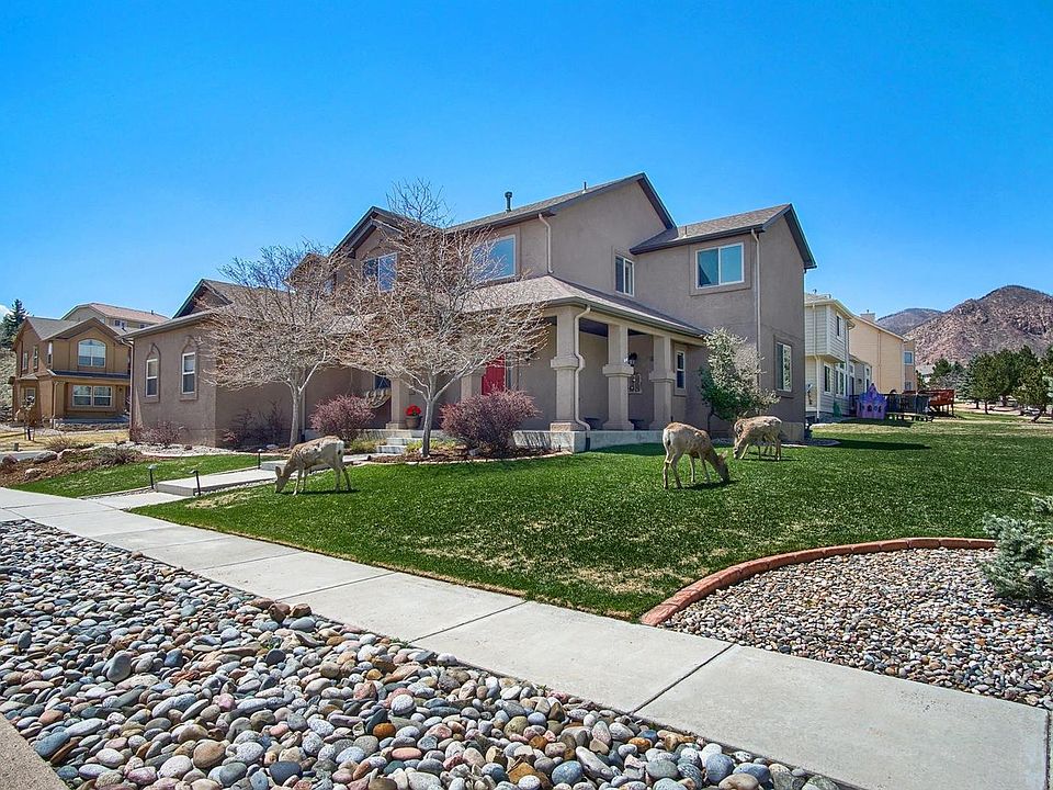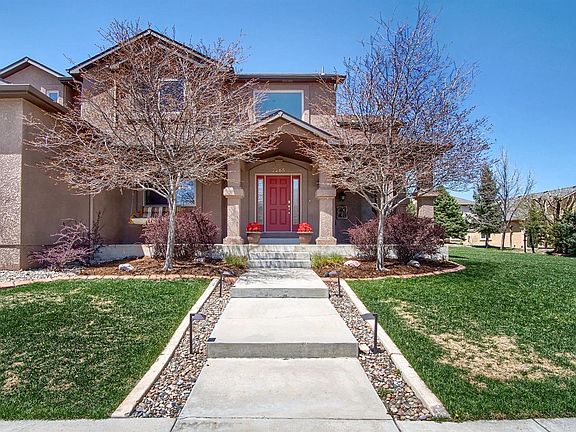 Gorgeous 2-story home nestled in the foothills of Mountain Shadows in northwest Colorado Springs. Boasting 6 bedrooms, 5 baths and 3 car garage. Enter the low maintenance stuccoed home from the generous covered front porch. Wide open foyer welcomes you. Great room concept is just around the corner with large windows for viewing the foothills. Large kitchen with double ovens, cooktop, 2 pantries, wine rack and more. Entertain in the dining room, breakfast nook or private outdoor patio. Main level bedroom and 3/4 bath. Main level is perfect for guests or perhaps a home office or study. Stunning city views from the upper level. Imagine the twinkling lights at night. On this level find the huge Master Suite, Junior Suite, 2 additional bedrooms that share a Jack N Jill bath and convenient laundry. Enjoy the Master Bath amenities His n Hers vanities, walk-in closet and linen cabinet. Finished basement is ready for cheering on your favorite team, gaming or catching a movie in the rec room.