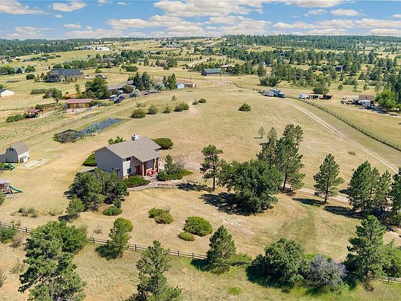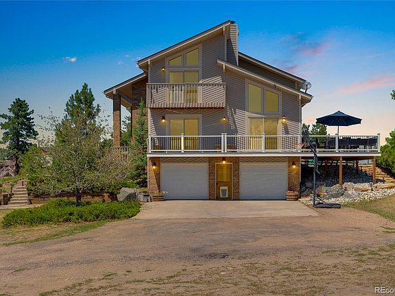 ** MOTIVATED SELLERS ** Welcome to your tranquil retreat in the beautiful Bannockburn neighborhood of Franktown! Situated on over 5 acres, this stunning home offers breathtaking views & a peaceful setting. As you approach, a lovely front porch welcomes you into the main level. Inside, the front dining room features sliding glass doors that open to the patio. The main living area boasts an open floor plan, perfect for modern living. The beautiful kitchen is a chef's dream with quartz countertops, a kitchen island, & stainless steel appliances. The kitchen flows seamlessly into a charming breakfast nook nestled into bay windows with bench seating, which then opens to the spacious living room. Here, you'll find many windows that bring in abundant natural light, vaulted ceilings, beautiful brick accents, & sliding glass doors that lead out to the deck. The main floor also includes a bedroom & a 3/4 bath. Upstairs, the primary bedroom suite impresses with vaulted ceilings, a private balcony, & a luxurious five-piece en-suite bathroom. Two additional bedrooms & a full bathroom complete the upper level. The basement offers additional living space with another bedroom, a half bath, & a laundry room. Outdoor living spaces are plentiful, featuring a large deck that leads out to the lawn, perfect for relaxing & entertaining. Additional amenities include a storage barn, an exterior home office, a custom chicken coop & run, & fenced garden beds. The property is fully fenced & gated, providing ample room for animals, gardening, & play. The lot is nicely treed between the house & the road, creating privacy & enhancing the tranquil setting. Enjoy amazing views of sunrises from the back deck & sunsets from the front deck. With plenty of room & no HOA restrictions, governing trailer storage, parking your trailers on the lot is easy & cost-effective, saving you from the need to build an expensive oversized garage! Don't miss this opportunity to make this tranquil retreat your home!