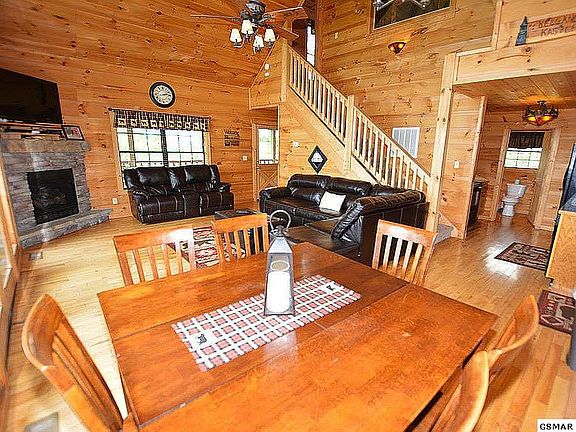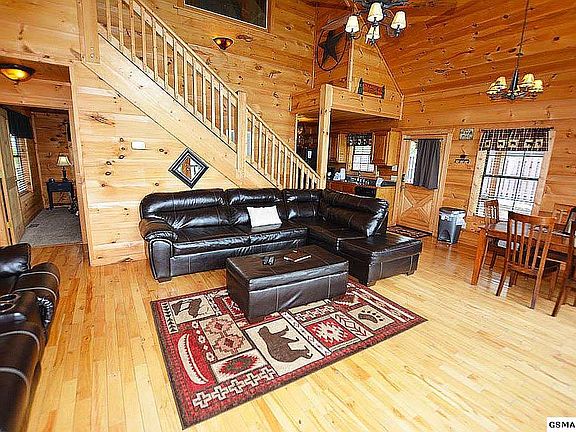 Very nice 2 bedroom, 3 bath cabin with 2 bonus rooms that currently serve as additional bedrooms. In a private setting with a spectacular view. Located in the Bluff Mountain area, you are only a few minutes to Pigeon Forge and Wears Valley. Features include an all wood interior, cathedral ceilings, hardwood floors, fireplace in the living room, rec room with a pool table, and spacious decks to enjoy the view. There is a handicap ramp to enter the home and there is a bedroom and bath on the main level. Comes fully furnished and decorated. Offered at a great price!