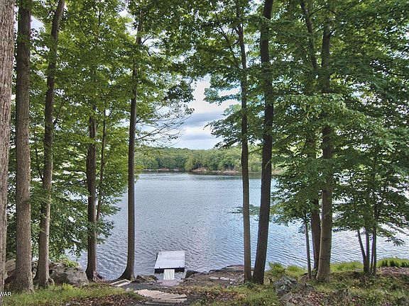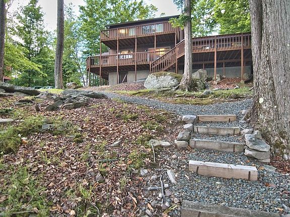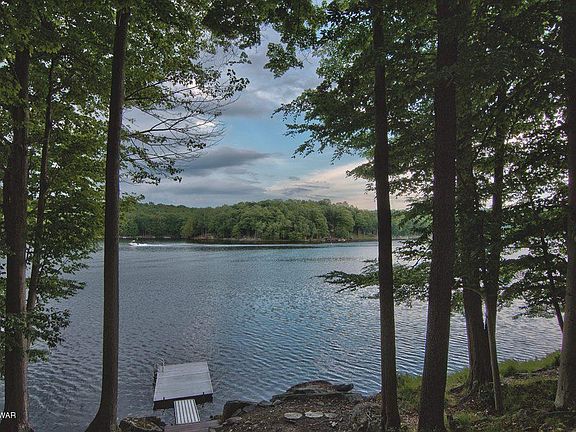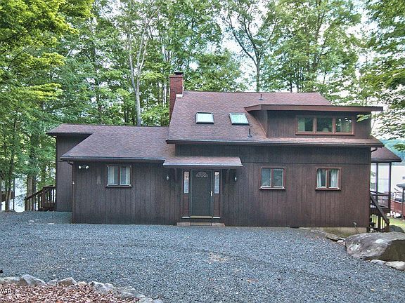 Powerboating lakefront home in a four season amenity filled community in the Northern Poconos, just over 2 hours from the NYC and Philadelphia areas. Walk across the road to the Beach, Main Lodge, Pool, Kiddie Pool, Tennis and Tiki Bar, yet also located on a quiet cul-de-sac. This 4 bedroom, 2 bath home has been METICULOUSLY maintained. Don't let the era of the decor fool you, it looks brand new and clean, clean, clean. The floor plan is awesome, the living room has high ceilings, there's a two way brick fireplace between the dining room and living room, access to the wrap around deck and screened in porch. There's a mudrom with laundry closet on the main level too. Huge Master Suite with large Upper Deck too! The lake views from this home are incredible.