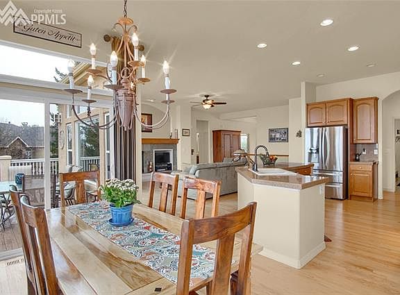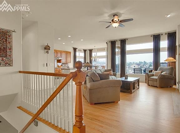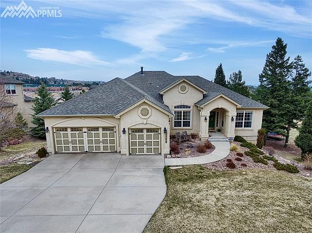 Stunning home in Peregrine! Bright & open layout allows plenty of sunlight through the multiple windows. Upgrades & desirable features are located throughout this ranch style home, including wood floors & 10ft ceilings on main level ~ office w/ built in cabinets ~ grand formal dining room ~ 3 fireplaces ~ stainless appliances, gas stove top & granite in kitchen ~ spacious master bath w/ walk in shower & huge closet ~ main level secondary bdrm, main level full bath ~ A/C, dual zoned furnace, 2 water heaters, continued... Walk out basement includes a large rec room/family room area with plenty of room for everyone! Excellent space for entertaining or just relaxing ~ 9ft ceilings ~ wet bar ~ gas fireplace ~ 2 bedrooms with attached bathrooms ~ expansive storage room in basement ~ Additional features of this home include a 3 car garage ~ laundry room with sink ~ fabulous back deck located off the main level and large patio off the basement level ~ auto sprinkler system ~ alarm system and so much more. Nice bluff views from the front and city views from the back. Convenient location close to Woodmen-Roberts elementary (a short walk behind the house) parks, hiking & biking trails. Located in desirable school district 20 - this is Colorado living at its finest!