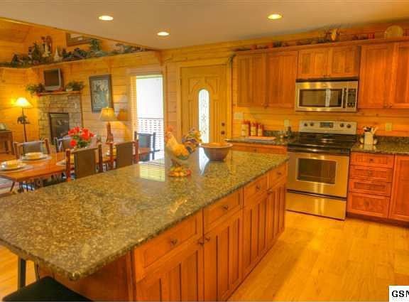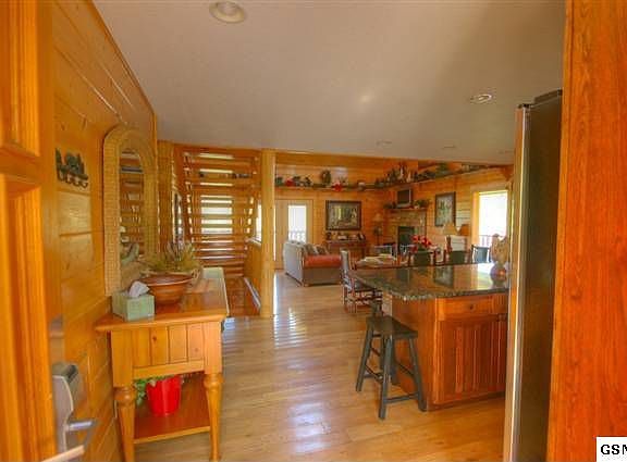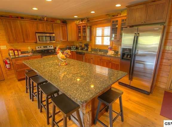 Get that WOW feeling as soon as you enter Mountain Drift. This huge custom log home features 5 master suites and 2 half baths. The first impression is of casual elegance. Custom made, rustic, log furniture and the log staircase are one of a kind. Hardwood floors, granite counters and stainless appliances all convey mountain luxury. Truly a chefs kitchen, even the cabinets are craftsman style and feature glass fronts and deep drawers for pots and pans. The living room boasts a stone hearth and gas fireplace and flat screen tv. The main level also has 2 master suites. One of which has its own French door to the wraparound covered porch. Up the beautiful log staircase is a large loft den with TV and seating for more. The huge master BR is also on this level and the private bath features a large whirlpool tub as well as a full tub/ shower. On the lower level, enjoy a game of pool in the large den or catch a movie in front of the large HDTV and second fireplace. There are two more open and airy bedrooms on this level and another wrap-around porch that overlooks the catch and release pond.