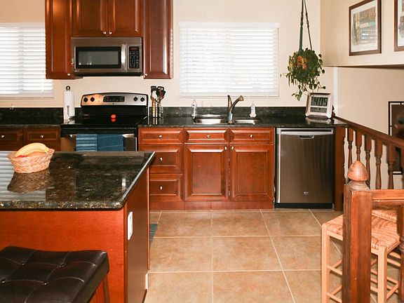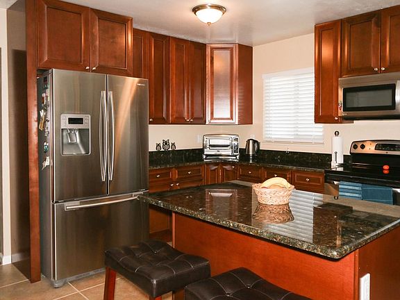 Spacious and beautifully maintained home in a quiet location. This home has remodeled expanded kitchen with granite counters and kitchen island, stainless steel appliances, beautiful tall cabinets and plenty of extra storage in oversized pantry. Large Master Bedroom with double closet. Nice bathrooms. Flooring includes bamboo, tile & carpeting. You will love the paint colors and trim. Big dining room to accommodate your large dining room furniture. Double pane windows. Air-conditioning. Some mountain view. Covered patio and a nice yard and a shed. New PV solar panels 2018