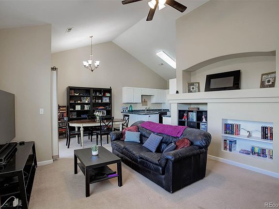 Updated 2 bedroom 2 full bathroom second floor condo with vaulted ceilings and no one above you! The kitchen is one of the largest in the community giving you ample storage and space with freshly painted cabinets. The kitchen is open to the dining room, balcony and living room making it great for entertaining. The living room is spacious with built-ins for storage. The large primary bedroom has vaulted ceilings, ceiling fan, dual closets and en-suite. The second bedroom is currently being used as an office but is spacious as well. The second full bath has a new vanity and hardware fixtures with a linen closet adjacent to it. The laundry room is just off the kitchen with extra storage space. The unit has a covered balcony off the front and has a storage closet as well. The community has a pool, hot tub, library, walking trails and is located in the Cherry Creek School District. Great location off of Arapahoe, close to E-470, Southlands, Saddle Rock and Heritage Eagle Bend golf courses. Some pictures are virtually staged. New roof installed 2023!