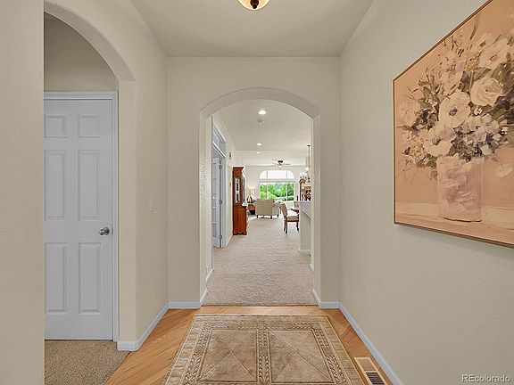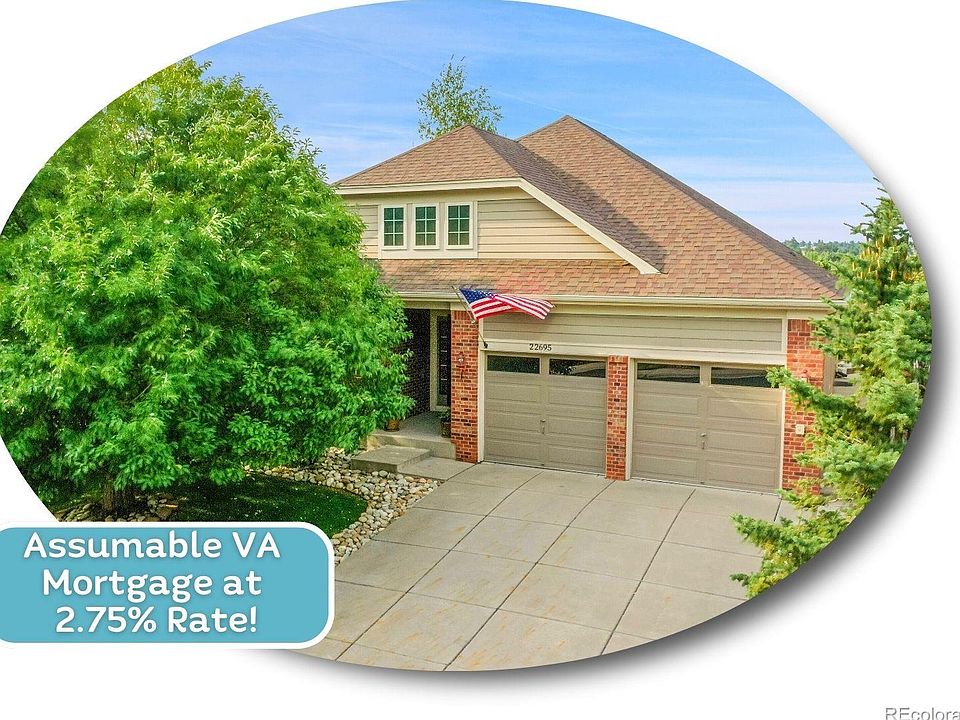 VA ASSUMPTION AT 2.75%!!! Backed by serene greenbelt views in Parker’s coveted Canterberry Crossing neighborhood, this rare 4-bed, 3-bath ranch offers main-level living and a finished basement designed for multigenerational living. A charming red-brick exterior and a classic shade tree welcome you, while manicured landscaping and a covered front porch set the tone for the home’s warm, inviting interior. Inside, a sunlit foyer with graceful arched entryways welcomes you into a bright, open floor plan accented by gleaming hardwood floors. Just off the entrance, a bright bedroom shares a full bath with a French-door office—perfect for remote work. A formal dining room with an elegant chandelier provides the ideal space for hosting, while the living room steals the show with a 3-sided fireplace and floor-to-ceiling windows framing picturesque greenbelt views. The adjacent eat-in kitchen features rich wood cabinetry, granite counters, and a breakfast nook with direct backyard access for al fresco dining. A convenient laundry/mud room off the kitchen provides access to the attached oversized 2-car garage. The main-level primary suite is a true retreat, featuring a large picture window, walk-in closet, and an updated 5-piece bath boasting a soaking tub, oversized glass shower with custom tilework, and dual sinks set in deep Caesarstone quartz. Downstairs, the expansive finished basement offers a rec room with a kitchenette and pantry, two bedrooms, a spacious three-quarter bath, and ample space for movie nights or game-day fun—offering separation of space for guests or loved ones. Discover a serene outdoor sanctuary in the fully fenced yard, nestled against the peaceful backdrop of the Sulphur Gulch greenbelt. Entertain with ease on the expansive stamped concrete wraparound patio, framed by a lush lawn, mature evergreens, and artfully designed xeriscaped accents for low-maintenance living. Enjoy a resort-style community pool, playground, and Black Bear Golf Club nearby!