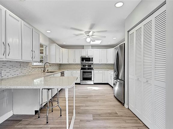This adorable maintenance free home is located in a peaceful, natural wooded setting in a well maintained 55+ community. This is a beautiful 2 bedroom, 2 bath, attached garage villa, with solid block construction and tile roof. It's an open floorplan with vaulted ceilings, skylights and view of the pond and fountain in the front. It's been completely updated just a year ago with new A/C and appliances. Including features that everyone desires such as wood look ceramic tile, updated bathrooms, all Stainless Steel kitchen appliances with all new backsplash & quartz counter tops, just to name a few. There is also an extra large covered porch with vinyl windows for year round enjoyment. Close commute to St. Petersburg or Bradenton/Sarasota via I-295 and I-75, the beautiful beaches of Anna Maria Island, shopping at the Ellenton Premium Outlets or UTC Mall and SRQ and TPA airports. Call today for your private tour.