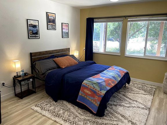 -A spacious bedroom with a queen-sized bed, a large comfortable couch, and two windows providing plenty of natural light. The room also includes a desk and office chair for a home office setup.