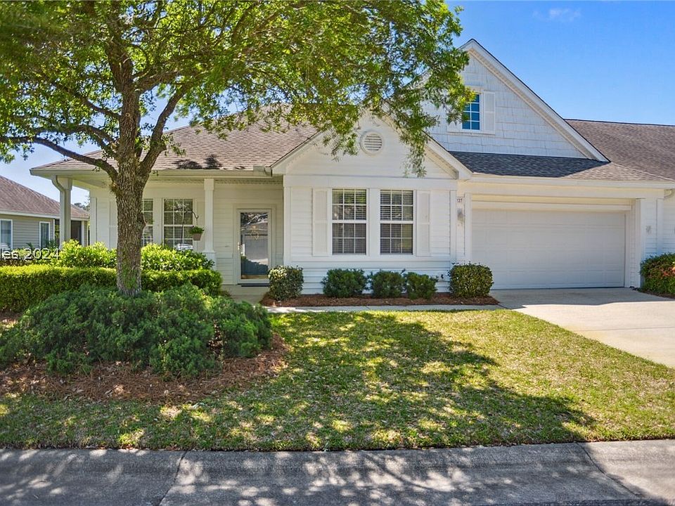 Rarely found expanded DICKINSON villa, conveniently located in Sun City is the setting for this charming home, gently used by part-timers. Hardwood floor welcomes you to living areas and kitchen has all new cabinet doors and drawers (2017). Enjoy two bedrooms, two baths and a den plus a lovely sunroom. Laundry room has a sweet built in desk for keeping track of household tasks. Garage has finished composite floor (2021), HVAC (2018). Vinyl siding and inviting front porch. Don’t wait. This could be it!