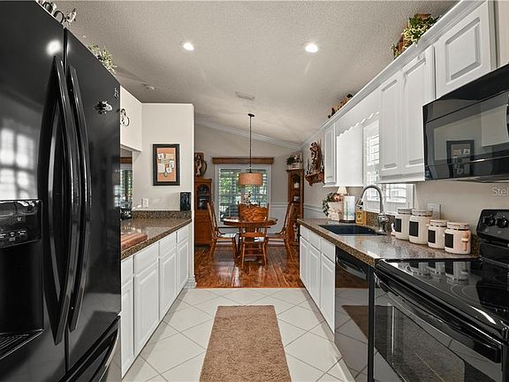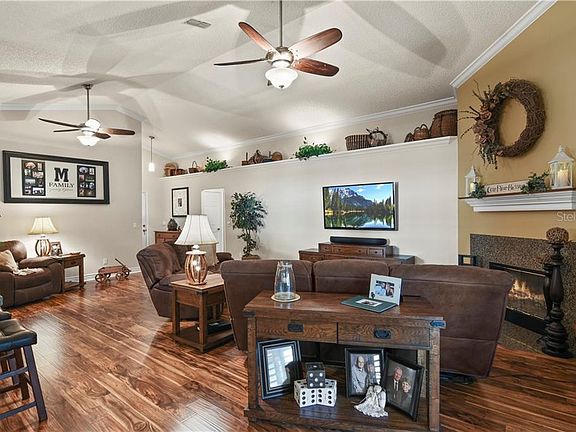 This gorgeous home radiates pride of ownership throughout with numerous upgraded features that make it stand out! Situated on a lot with beautiful curb appeal, mature manicured landscape and fenced in with no rear neighbors. A brick paver walk way leads inside to an open and split floor plan that's designed for convenience and comfort and an enormous great room features vaulted ceilings and a wood burning fire place. Living spaces display distressed laminate wood flooring, kitchen and baths ceramic tile and bedrooms are carpeted. Crown molding, 5 ¼ baseboards and plantation shutters have been installed in all rooms. Kitchen includes granite countertops, black granite farmhouse sink, appliances, breakfast bar and opens to the dining room. Master bedroom features vaulted ceilings, slider doors and master bath includes a dual vanity with custom built in shelving, tiled shower and garden tub. Stay organized with a spacious master closet with custom built in shelving and cabinets. Two additional bedrooms share a hall bath and are located on opposite side of home. Enclosed brick paver lanai features vinyl windows and is screened in to enjoy outdoor living all year round in any condition. A paver patio extension offers more space to gather and is situated off of enclosed lanai. Additional home features include newly installed roof and gutters (just 6 mo. ago), new hot water heater, vinyl fencing, a washer/dryer set included, programmed outdoor lighting and home security system. Hurry, this one won't last long!!