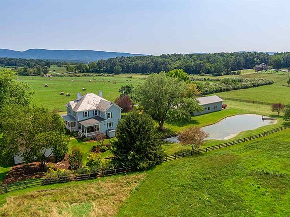 Your dreams have come to life at Spring Hollow Farm. Farmhouse meets Victorian nestled on 14+ acres surrounded by pastures and rolling hills. Blue Ridge Mountain views will greet you everyday right off your front porch. Most rooms on main level have a FP including a double sided FP connecting your dining and living room. You'll love preparing meals in your spacious kitchen with heated floors that features a custom table that seats 8 & matches your kitchen countertops. Brand new well. Two detached garages including a 3-car garage with oil heat, tank for gas, table lift for mowers & motorcycle, 1/2 bath & wash sink. Relax and enjoy the peaceful setting on your covered porches or by the large pond. This incredible home will capture your heart.