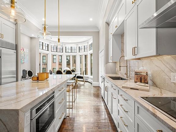 Elusive middle duplex w/12FT ceilings 1 flight from sidewalk is enveloped by picturesque Brownstones! Splendid 2nd & 3rd flr front to back home offers prime center Back Bay local b/w Berkeley & Clarendon. Easy access to Esplanade footbridge & Charles River. Conveniences of Boston’s premier neighborhoods w/world class shopping/dining/arts at your doorstep. Tasteful renovations of kitchen/baths. Chef’s kitchen w/42IN Subz fridge, two Wolf ovens/induction cook top & large Quartzite Taj Mahal waterfall island w/counter seating. Magnificent sun-splashed South facing floor to ceiling curved oriel allowing for views of the Back Bay towers. Full building width living area w/original mantel & 3 over-sized front bay windows looking onto historic Beacon St allows for flexible furniture arrangement. Powder room & coat cl complete this floor. Upper floor w/2 large king-sized beds w/primary bed w/en-suite white quartz bath/double sink vanity/step-in shower. Central AC. W/D in unit. 2 rental parking.