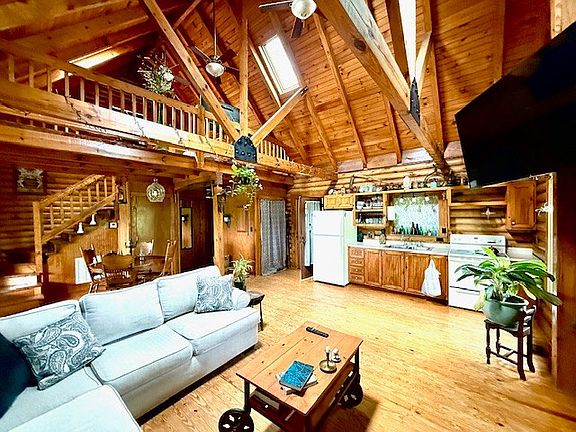 RETREAT, MINI-FARM, COUNTRY LIVING 3 MILES FROM DOWNTOWN, This 1BR 1BA open concept log home with loft, Fireplace, rich Wood beemed ceiling and all purpose Florida room sits on almost 10 acres with horse barn, pond, spring, perimeter fenced with multiple riding trails, sweeping breathtaking views, border stack stone rock wall from the 1800s and all the privacy and tranquility one could desire. A RARE FIND!