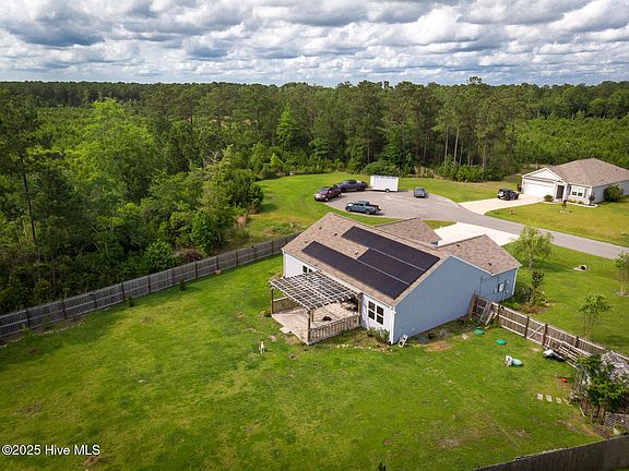 Welcome to 227 Cheswick Drive, a well-appointed and energy-efficient home located in the growing coastal community of Holly Ridge, NC. This thoughtfully updated 3-bedroom, 2-bathroom residence offers comfort, functionality, and modern style in a peaceful neighborhood setting. Inside, you'll find a spacious open-concept floor plan that seamlessly connects the kitchen, dining, and living areas—perfect for both entertaining and everyday life. The home features durable, low-maintenance flooring throughout with no carpet, providing a clean and cohesive aesthetic. The kitchen offers ample cabinetry and counter space and flows naturally into the living and dining areas, creating a bright and airy atmosphere. One of the standout upgrades is the state-of-the-art hydrotherapy tub in the guest bathroom—designed to soothe sore muscles, improve circulation, and promote deep relaxation. Step outside to a backyard oasis, complete with a custom pergola-covered porch, serene rock garden, and mature landscaping that includes Twisted Willow, Hybrid Willow, and traditional Willow trees in the back, along with River Birch trees and additional greenery enhancing the front yard. For gardening enthusiasts, a dedicated greenhouse provides a perfect space for year-round planting, seed starting, or cultivating your favorite herbs and vegetables. Sustainability and savings go hand-in-hand with the full solar panel system, paired with Generac backup batteries—fully paid off by the seller at closing for peace of mind and long-term energy efficiency. The expanded driveway offers double the parking capacity, perfect for hosting guests or accommodating multiple vehicles, and includes a 50-amp camper outlet—ideal for RV enthusiasts or travelers. With its seamless blend of indoor comfort, smart energy features, and outdoor charm, 227 Cheswick Drive is minutes from Stone Bay and Courthouse Bay. Showing now!