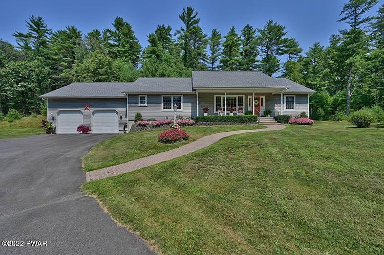 LONG PRIVATE DRIVEWAY LEADS TO THIS ULTRA PRIVATELY SET CUSTOM BUILT ORIGINAL OWNER RANCH HOME ON 1.85 ACRES!! Beautifully landscaped with a welcoming covered front porch that leads you into the great room with vaulted 20' ceilings open to kitchen with snack bar and dining room. Sliding glass doors lead to the 4 season Pocono Room with lots of windows and deck on back of home. Laundry mud room as you come in from the oversized 2 car attached garage off the kitchen. There are 3 good sized Bedrooms; Master Suite with private en suite bath and walk in closet with the other 2 bedrooms and full hall Bath located on the opposite side of the house. Gleaming, wide plank, hardwood floors, tiled baths, and carpeted bedrooms.