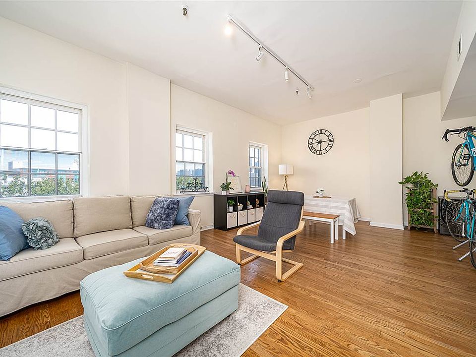 One of the best top floor Duplex layouts in the building. Gorgeous 2 Bedroom + 1.5 Bath Duplex Condo with large private outdoor deck, 1 parking space and tons of closets for storage. This 1,085 SF Duplex has a spacious layout with a large living room & dining area with high ceilings. Fantastic natural light and hardwood floors flowing throughout the entire unit. The modern kitchen includes stainless steel appliances, granite countertops, wood cabinets and white marble backsplash. As you make your way up, there is a great half-bath located at the split-level landing. The top floor contains your Master bedroom with vaulted ceilings, skylights and access to your large private outdoor deck with North, West and East vantage points for gorgeous views of both Jersey City and New York City skylines. On the 2nd floor is a great bathroom with deep soak tub, large subway tiles and vanity. Also, on the top floor, the 2nd bedroom is perfect for a guest room or home office. HOA includes a parking space, gas, water, heating and cooling, 8,000 sq ft multi-use lifestyle center with gym, basketball/volleyball court, locker rooms, sauna and screening room, plus Concierge office for packages and round-the-clock security.