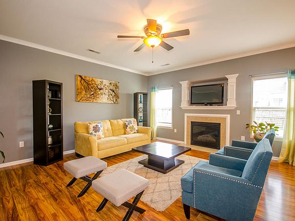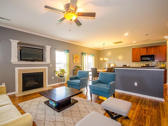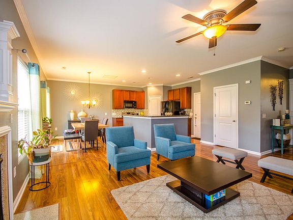 When you enter this home your heart will melt! You are greeted with breath taking moldings and beautiful wood floors that run through the entire first floor of the home. As you enter the great room you notice the gas burning fireplace with a marble hearth surround, crown molding, ceiling fan and tv mount with large moldings. The great room is also very open to the large and spacious eat in kitchen. The kitchen has an eat at island with a dual sink, black dishwasher, stainless steel electric range, built in microwave, 42'' cabinetry giving you ample cabinet space and counter space. Once you make it upstairs you are greeted with french doors that enter the Master Bedroom which is split from the other rooms, has a trey ceiling, ceiling fan and own private masters bathroom.