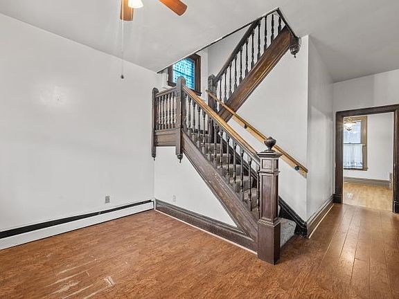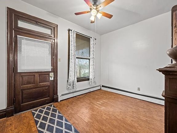 Spacious home, with 4 bedrooms and 1.5 baths. Off-street parking for 2 vehicles. Large entryway, eat-in kitchen, with appliances included. Decorative fireplace and built-in cabinet, in the dining room. Pocket doors and another decorative fireplace, in the sizable living room. The full bath, bedrooms, and 8x3 storage room are located on the second floor. Partially finished walk-up attic. Central air. Being sold AS-IS. Home warranty included.