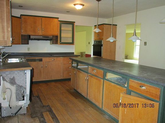 Located at the end of dead end street, hardwood floors, brick fireplace in living room with bookcase, dining room, large island in kitchen, lots of cabinets, 3rd bedroom with built ins, breezeway, attached garage with additional room added on, deck, fenced yard, full basement with 2nd fireplace, being sold as is.