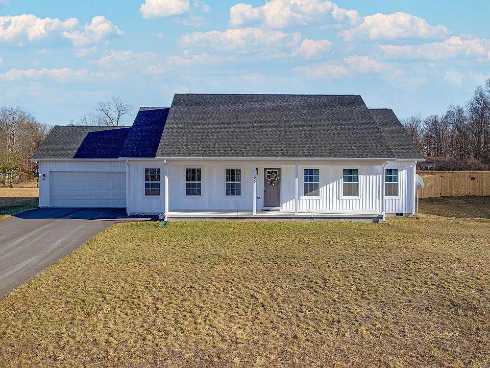 Welcome to your dream home! This charming ranch-style home, built only one year ago, offers the perfect blend of modern style. Nestled at the end of a lane this location offers both peace and privacy with no HOA. The open floor plan with vaulted ceiling seamlessly connects the living and dining areas and creates a spacious atmosphere from the moment you walk in the front door. The heart of the home is the well-equipped kitchen with stainless steel appliances. farmhouse sink, and granite counter tops. Whether you're preparing a cozy meal or hosting a gathering, this kitchen is designed for both functionality and style. There are three spacious bedrooms with the master on one side and guest bedrooms on the other. Master bath features dual sinks and large walk-in shower with sliding glass. Relax out back on the new 12x12 deck. The attached front-entry garage accommodates two vehicles comfortably. Enjoy the peace of mind that comes with a property that's still very much a brand-new home. Don’t miss the opportunity to make this your new home! Call Today!