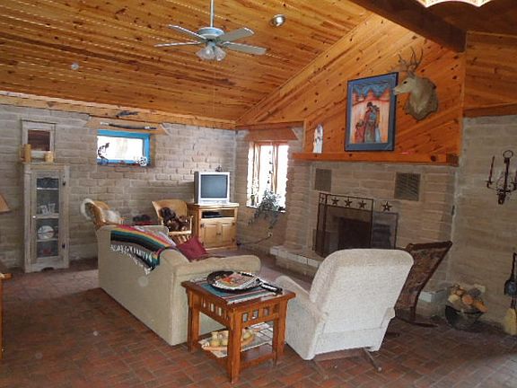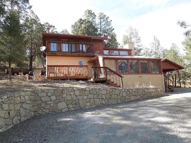 TWO BEDROOM TWO BATH HOME CONVENIENTLY LOCATED IN DESIREABLE WHITE MTN. ESTATES & ONE OF THE LEAST EXPENSIVE! SUNROOM ON FRONT, MUDROOM ON SIDE WITH CARPORT AND ENCLOSED STORAGE. MOUNTAIN FEEL PINE COVERED WALLS IN LIVING AREA. BRICK FLOORS IN LIVING AREA, KITCHEN & DOWNSTAIRS BATHROOM. UPSTAIRS MASTER BEDROOM HAS A NICE WALK IN CLOSET AND A PRIVATE PARTIALLY COVERED DECK WITH PLEASANT VIEW OVER THE PINES. METAL ROOF. ADOBE CONSTRUCTION WITH STUCCO EXTERIOR BUILT TO COOL BY UPDRAFT. ORIGINALLY BUILT AS ENVIRONMENTAL HOME & IS VERY EFFICIENT. STAINED GLASS WINDOW AT TOP OF STAIRCASE. IN NIGHTLY RENTAL POOL WITH HISTORY. KITCHEN & BATHROOMS RENOVATED IN 2000. FULLY FURNISHED.