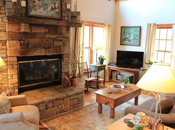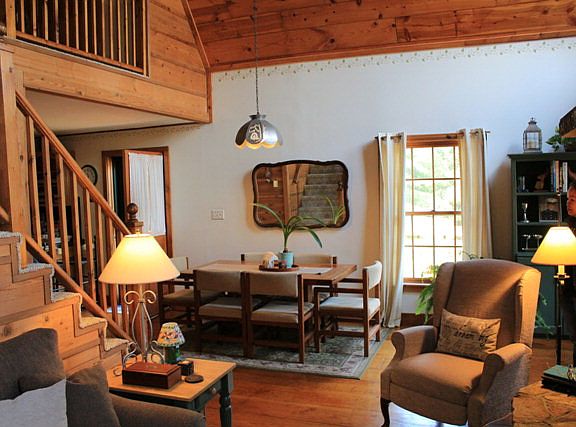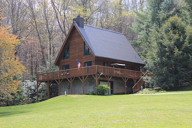 The cabin that pictures are made of......This home sits upon a easy rolling grassy knoll. It features a stone fireplace, tall ceiling and beautiful wood floors. It has a view and could be better with some tree trimming. The basement could be finished for additional living space.
