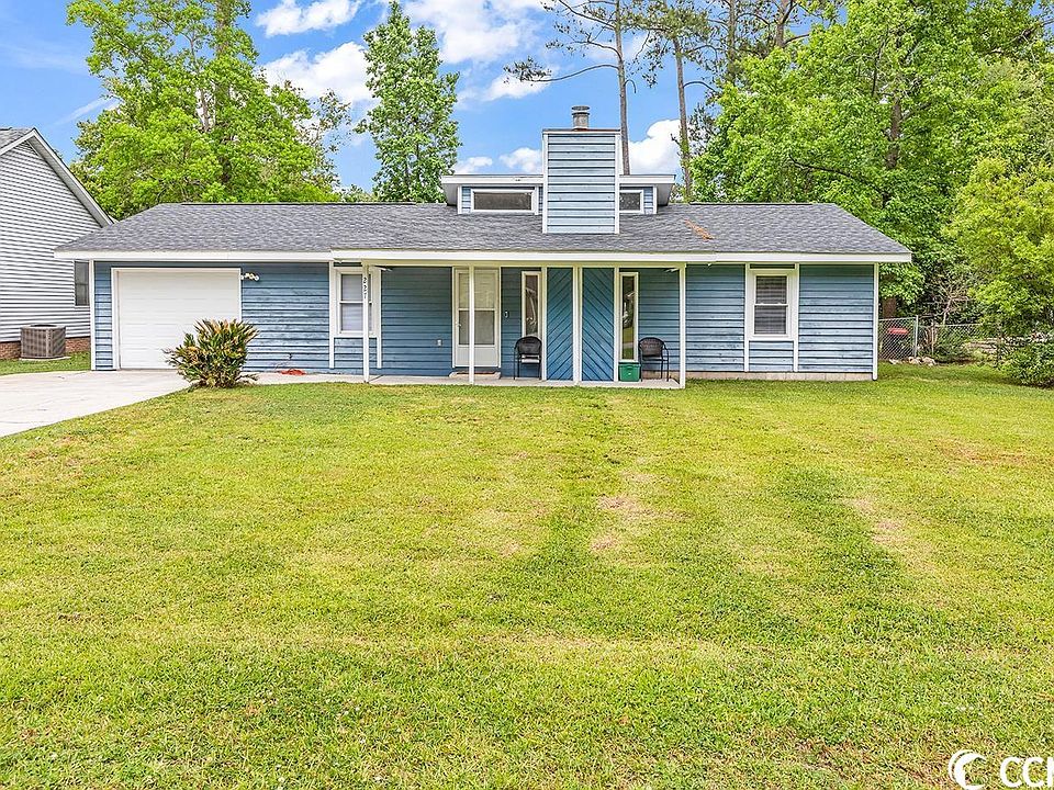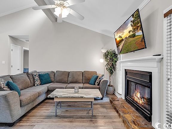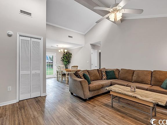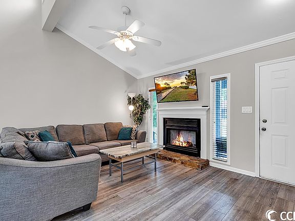 This 3 bedroom, 2 bathroom home is located in the quiet, Country Manor Community, located off of 707 in the Socastee area of Myrtle Beach. You walk in the front door into the spacious, airy, living room with vaulted ceilings, sky lights, luxury vinyl plank flooring, a ceiling fan, fresh paint, designer rectangular windows on either side of the wood burning fireplace with a beautiful stone apron. And it has a large tv already mounted for the new owners. The dining area is located to the rear of the home and boasts a view through the double french doors of the huge, fenced in back yard. The Galley style kitchen features quartz countertops, a large, deep, country-style, single bowl sink, Stainless steel appliances, LVP flooring, with lots of cabinet storage available. The bedrooms are split. The Primary bedroom has LVP Flooring, a walk in closet, a ceiling fan, built in shelving, and its own full private bathroom with quarts countertops. The remaing two bedrooms are separated by a full bathroom and have new updated carpet and ceiling fans. Other areas include a separate utility/laundry room and an attached single car garage. And lets not forget, there is no HOA! Easy to see, just schedule a showing through your Realtor.
