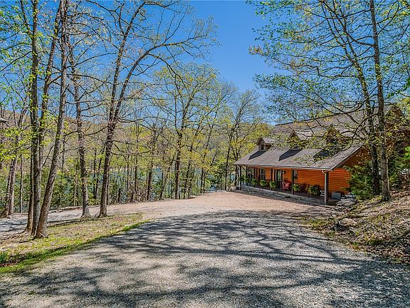 Tucked away down a gated driveway, this 1.57-acre estate rests on picturesque shores of Beaver Lake w/exceptional waterfront access, featuring a sandy beach adjacent to Starkey Marina. This charming fully furnished log home is wrapped in an expansive covered porch, deck w/hot tub, fire pit & scenic cave. Light & airy atmosphere, w/white beadboard walls & large windows framing lake & wooded views. The open floor plan effortlessly connects living, dining, & kitchen areas to the wrap around screened in porch, creating a seamless transition between indoor & outdoor spaces. Huge primary suite w/cozy Fireplace sitting area, en-suite bath, & private access to screened-in porch. The upstairs houses a reading loft/bonus room & 2 additional spacious guest en-suites, each w/their own private bath & walk-in closets. Great unfinished basement area w/sink. With its breathtaking views, exceptional amenities, & prime waterfront location, this property offers the idyllic lakeside lifestyle.