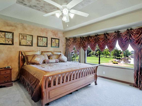Beautiful Open floor plan and spectacular view of lake behind this home as you walk through the front door. Plank wood flooring throughout the main floor of this home. Large Formal Dining and Living rooms areas that both have great views of the lake behind the home. The Kitchen features Granite countertops, lots of cabinet and counter space and an eating bar and eating area. A large hearth room with fireplace and a great view of the lake. The hearth area has access to a large 28 x 15 covered deck. The main floor has a large bedroom with a full hall bath and a tiled shower. Master bedroom has a coffered ceiling with again that great view of the lake. Master bathroom has heated tile flooring, 2 sinks with granite counter tops, walk in closet and a separate shower and tub. Most of the main floor has just been painted. The basement is a full view-out, walkout basement. Very open with a rec. room area and Family room area with a 2nd fireplace and very nice Wet Bar. There are 2 very nice sized bedroom with welkin closets and a 3rd full bath room. There is and other room that could be an office, play or exercise area with new carpet. There is also a very larger storage are with built in shelving. The roof is brand new and is an IR class 4 roof. The remaining features are a 3 car garage, well and sprinkler system, no specials and a large back yard with the lake view. More than enough room for a pool if that is your desire. This home is located in a great area in west Wichita.