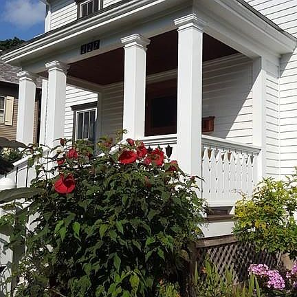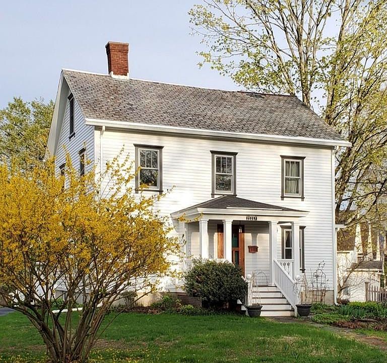 Sunny, spacious, beautifully landscaped home with 5 bedrooms and 3 full baths, minutes to downtown and close to the bike path. This 1906 colonial has been completely restored both inside and out: all new windows, mahogany trim, siding removed, clapboards replaced, newly painted exterior, new asphalt roof, and new front porch with mahogany floors. The interior has been completely repainted and replastered with period lighting installed. 3 floors of living space, hardwood floors throughout, large sunny eat-in kitchen, living room, den, office and full bath on the 1st floor; 4 bedrooms on the 2nd floor, bath with a clawfoot tub; the 3rd floor has a private master suite with master bath. Perennial gardens surround the house, gas heat, 2 car detached garage, a screened porch off the kitchen in the back of the house. 1st showings at open house Sat, 5/11 from 11am-1pm.