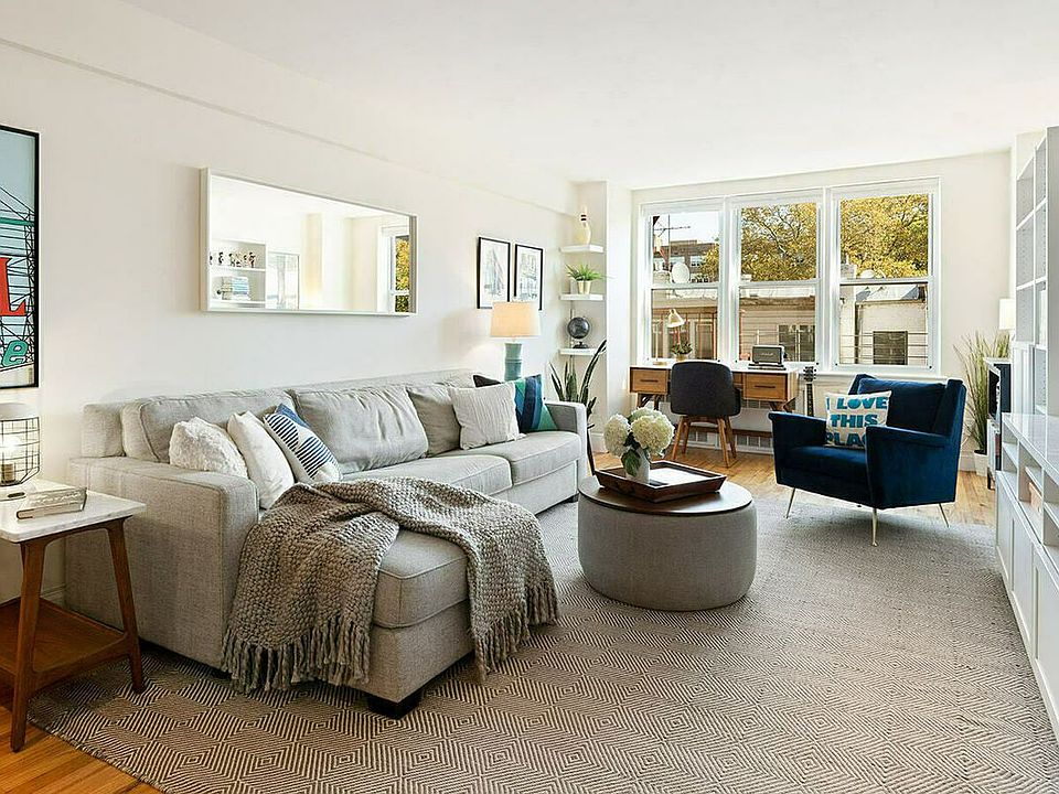 Elegant, sun-filled, and well-proportioned, this lovely 2BR/1BA is nestled on the 3rd floor of a desirable elevator building. This home has undergone a thorough and thoughtful renovation. An entry foyer with a large closet leads to the expansive and inviting living room with ample space for living and dining. A wall of windows peacefully overlook treetops in the rear of the building. The open, windowed chef's kitchen has been tastefully designed with shaker wood cabinets and stainless steel appliances, including a dishwasher, a slide-in gas range with a hood, and a side-by-side refrigerator with ice-maker, granite countertops, a modern subway tile backsplash, and a sizable breakfast counter. The crisp, clean bathroom has also been updated. There is a king-size master bedroom with a wall of windows, a ceiling fan, and a generous closet. A second bedroom with a ceiling fan is situated across the hall. Two additional closets offer ample storage within the living space. Other highlights include refinished hardwood flooring, new windows, in-wall air conditioning, and a video intercom system. Plans are in the works for a furnished common courtyard for residents to enjoy. Positioned in the heart of Kensington along majestic Ocean Parkway, just steps from a multitude of shops and mass transit, the cat-friendly elevator building offers communal laundry facilities, a sleek new lobby, wait-listed parking, storage, on onsite super and porter, and sleek bike storage. The building has recently been wired for Verizon Fios, and solar roof panels powering common areas keep maintenance fees low. Currently zoned for District 15 schools.