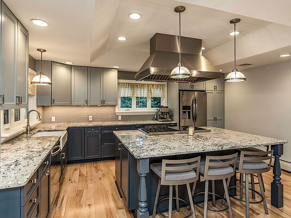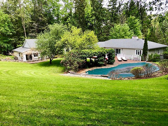 One floor living with your own private oasis in the backyard! This updated ranch home sits on over 2 acres, has a newer roof & windows, new kitchen, new master bath and a new guest house with a fireplace, 3/4 bath & bedroom. Heated inground pool & a new Brazilian walnut wood deck in a fenced in yard. The lower level provides extra living space with a fireplace, bar, 3/4 bath & a second kitchen.