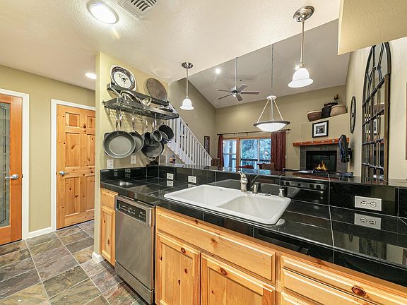 Gas fireplaceDeck facing the pinesDetached garageTop floor homeWell appointed kitchen