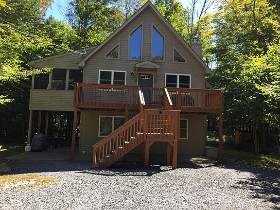 Wow what a perfect one family rental property! 5 Bedrooms, 3 Baths, 2 full living room spaces, two full kitchens. Perfect multi-generation escape to the Poconos, everyone has their own space. Professionally cleaned after each rental.Upper level living boasts a beautiful stone propane fireplace for cold winter nights. Cathedral ceiling on upper level. Two bedrooms, Loft and Full Bath on third level; great use of space. Screen porch, covered patio, horseshoe pit ''ready''. PS...there is a garage! Come see, this is a good one! Renter occupied, showings begin 9/23, check showingtime for available dates.