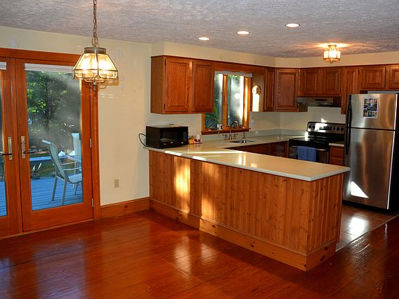 This lovely cape home invites you in with an open feel thanks to it's cathedral ceiling and large open spaces. There are wide plank spruce floors throughout and a fireplace to keep you warm during the cooler months. Natural gas leads to easy heating maintenance and sought after gas cooking. Three bedrooms, including a spacious master suite with walk-in closet,1st floor bedroom and a large loft area. Other features include nest thermostat, replacement windows, silestone counters, first floor laundry and full basement. There is also a private beach on Jenkins Pond. Come view this home while the fruit tress are in bloom! See you soon!