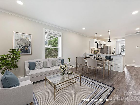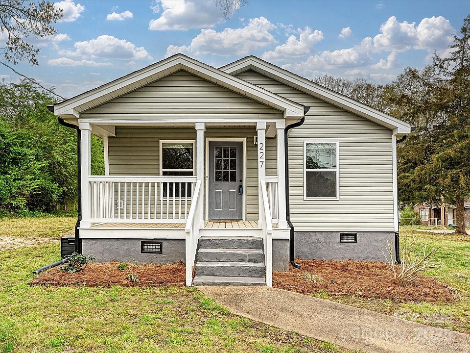 A completely remodeled two bed, two bath gem in south Gastonia with high quality finishes! This adorable bungalow with a cute and welcoming covered front porch has a wonderful interior layout too. It was renovated top to bottom in 2022 with new walls, new LVP floors, new trim work, a barn door entry into the en suite primary bath, tiled baths, new vanities, ceiling fans, recessed and pendant lighting, stainless steel appliances, granite counters in the kitchen with a breakfast bar, a laundry room area, plus all new HVAC, water heater, roof, gutters, siding, windows, and gutter guards which were added even more recently. This home is really like new and makes a great starter home for breaking into home ownership with a single family home. No detail has been overlooked in this charmer!