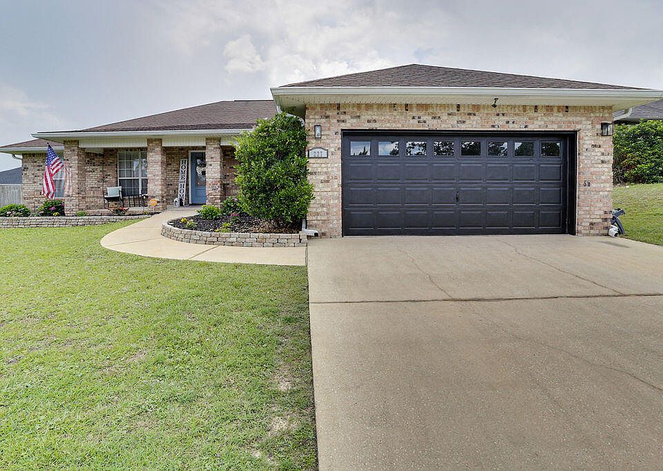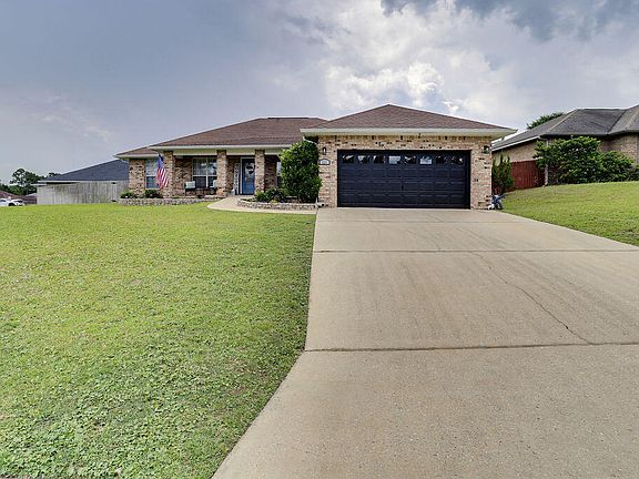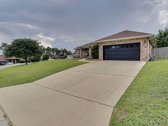 WELCOME HOME! This all-brick contemporary-style home stands boldly on a large corner lot at Alicia Place in south Crestview. This home is nearly 2600 square feet of living space which includes 4 large bedrooms, 2 bathrooms, a dining room and a dedicated flex room to use as an office or anything else that fits your lifestyle. Vinyl-planked flooring flows through most of the walkable areas with new marble-esque tile recently installed in the laundry room and bathrooms. The expansive kitchen has seemingly miles of countertop space and is open to the massive livingroom complimented by tall cathedral ceilings. The primary bedroom is located on its own wing of the home including a very generously sized ensuite with a double vanity, two large closets and a separate shower and garden tub.