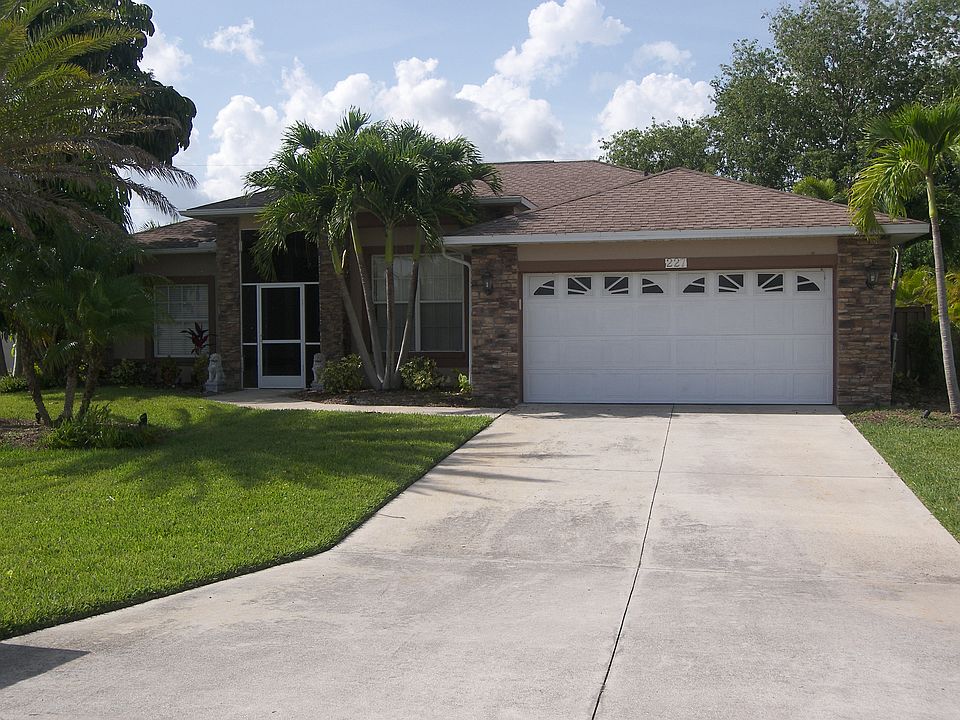 Beautiful tropical paradise, perfect for entertaining or just enjoying!! Tons of different palms surround this beautiful 3 bedroom 2 bath home in Central Cape Coral. Stone accents on the front of this home make it stand out in a crowd!! Enjoy your heated pool, heated spa and fantastic built in BBQ on the lanai or your deck with fire pit. Trex fencing adds to the privacy of your back yard grotto. Inside, all tile floors except some bedrooms have woodlike floors. Kitchen features Stainless steel appliances, lots of cabinets, pantry and breakfast bar. Large master suite features double sinks, shower and walk in closet. Make your appointment today to view this beautiful home before it's gone. Brokered And Advertised By: Century 21 Sunbelt Realty, Inc Listing Agent: Terry L. Carlson PA