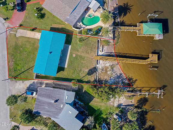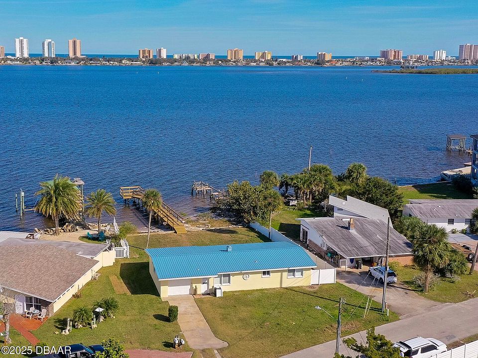 Direct Intracoastal Home with Brand New Private Boat Dock! This beautiful 3 bedroom, 2 bathroom home with attached garage offers the ultimate in waterfront living with a brand new private boat dock and sandy beach. This property is a true gem for water enthusiasts and nature lovers alike. New metal roof in 2019. Step inside to a bright and open floor plan, with freshly painted interior and solid surface flooring throughout for ease of care. The home's charming wood slatted vaulted ceiling with white beams adds a touch of coastal elegance and enhances the airy, spacious atmosphere. The picture window in the living room invites abundant natural sunlight, showcasing the captivating views of the Intracoastal. The spacious kitchen features crisp white cabinetry and a convenient breakfast bar for casual dining. The flow of the kitchen to the living area ensures that the scenic beauty of the water is always in view...Continued... Outside, a large back patio offers a tranquil retreat, where you can relax and take in the peaceful Intracoastal views, watch the boats go by, or simply enjoy the refreshing breezes. The large backyard offers plenty of space to add a pool to create your very own backyard oasis. The home features three generously sized bedrooms and two full bathrooms. Whether you're looking for a family home, a seasonal getaway, or an income-generating rental (STR - short term rental allowed), this property is perfect for a variety of needs. Located in a fantastic area with easy access to I-95 & I-4, shopping, dining, entertainment and the famous beaches of Daytona, this home offers the best of both convenience and coastal charm. Don't miss out on this rare opportunity to own a piece of paradise on the Intracoastal! All information in the MLS is intended to be accurate but cannot be guaranteed.
