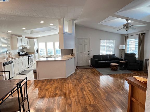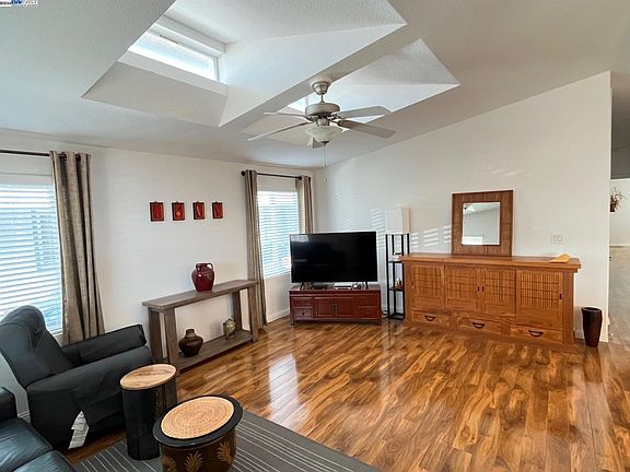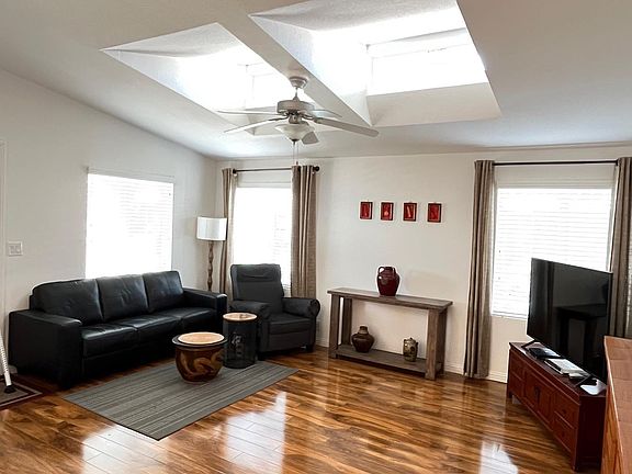 Beautiful home & only 7 years young. Spacious living room with skylights & open to dining area. Nice kitchen with plenty of cabinets, breakfast nook, corian counters, & appliances to stay. Good size bedrooms, primary bedroom with double closets. Primary bath with dual sinks, & stall shower. Hall bath with single sink & tub shower. Indoor laundry with storage & washer/dryer. Laminate flooring throughout most of home except wet areas. Composite decking front porch & rear steps. Storage shed. Close to clubhouse, pool, & spa. Guest parking a few steps away from the home. Conveniently located close to Greenhouse shopping center & freeway.