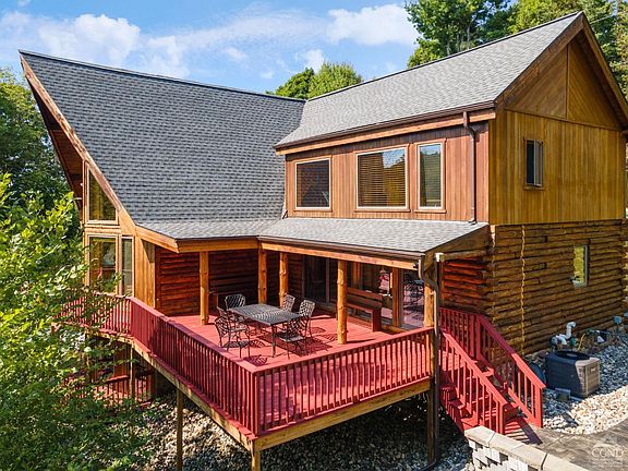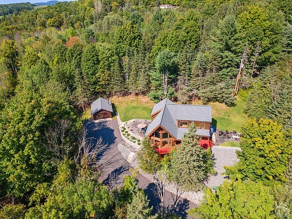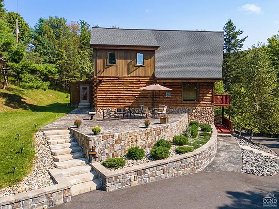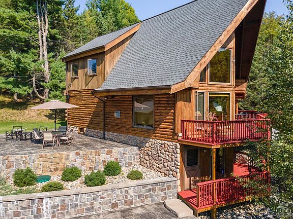Stunning log chalet nestled hillside offering seclusion and nature-lovers' sanctuary. End of road setting. As you enter you are greeted by a meticulously renovated custom interior. Sun drenched great room with cathedral ceilings, stone fireplace and floor-to-ceiling windows. A spacious kitchen with new high end appliances, gorgeous countertops and sliding glass doors to one of two covered porches. Enjoy sunsets from the new stone patio. A full finished lower level with family room, potential bedroom and full bath. Perfect home for family entertaining or weekend escape. Just minutes to the Village of Cobleskill and quick access to I-88 for an easy commute to Albany or Oneonta