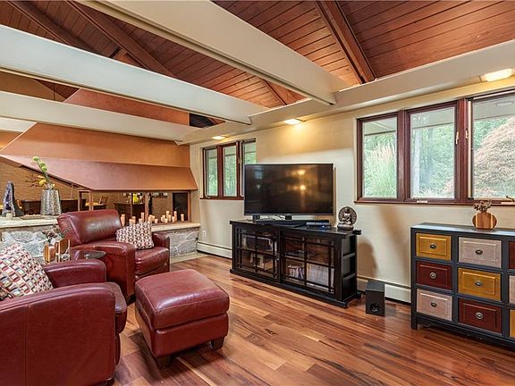 True one of a kind property setting privately back on a mature treed lot that resembles no other. Designed by renowned visionary architect James H Johnson also known for The Mushroom House and many other incredible structures. Beautiful open concept contemporary built with quality. Amazing beamed vaulted ceiling and open balcony walkway overlooking the first floor! Deluxe main Bath, stone shower base, ceramic surround, and large custom vanity. The kitchen features rich Mahogany cabinetry and Concrete Counter tops! Includes bonus first floor suite with separate entrance and full bath. Can be great flexible space for office, In-Law, or hobbies! Many recent upgrades including a new roof! If your looking for a piece of Rochester history take a look!