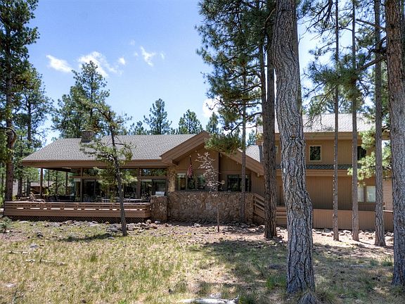 This majestic mountain retreat offers an inviting and relaxed living space, showcasing a stone-faced wood burning fireplace and vaulted ceilings accented by full-wall windows allowing bright light. Beautiful, high-quality craftsmanship is displayed in the built-in cabinetry. The efficiently designed kitchen features granite counter tops, a breakfast bar, elegant cabinets and a breakfast nook for more informal dining. The master bedroom and additional two bedrooms are all located on the main floor. The master bedroom is tastefully appointed with the fireplace being the focal point of the room. The bonus room/game room is perfect for the kids or adults to escape from the main living space. Furthermore, the custom built-in cabinets and desk could also make for a private office space. The home is located near the 16th tee of the acclaimed Canyon Golf Course and offers peaceful views down the fairway. The wrap-around deck makes for a great place to enjoy quiet reflection or for entertaining family and friends. Don't miss the opportunity to live in this beautiful and highly-liveable, move-in ready home in the award-winning Forest Highlands Community.