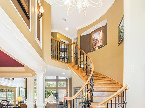 - Kitchen Island, Window Treatments, Walk-In Closet(s), Other, Built-Ins, Dining Area, Crown Molding, Open Floorplan, Wood Floors, Bar, Wet/Dry Bar, Entry Level Bedroom, Upgraded Countertops, Kitchen - Gourmet, Family Room Off Kitchen, Chair Railings, Curved Staircase, Primary Bath(s)