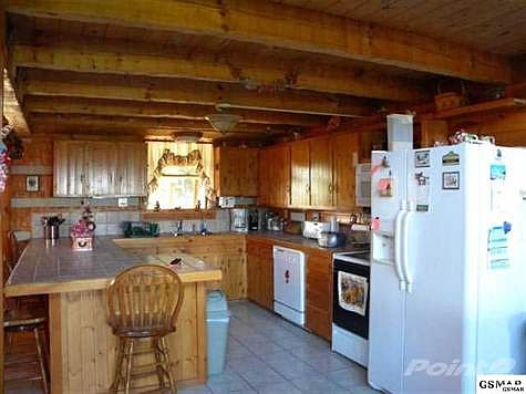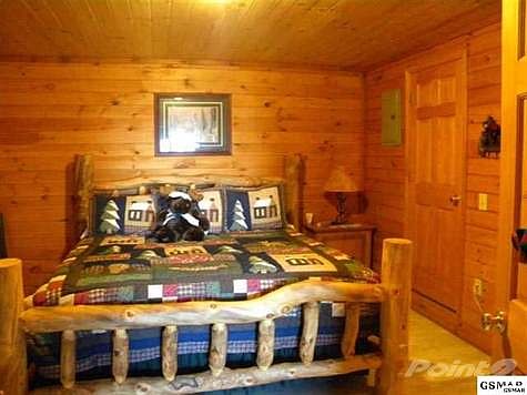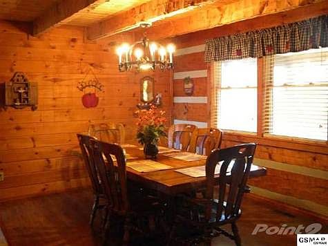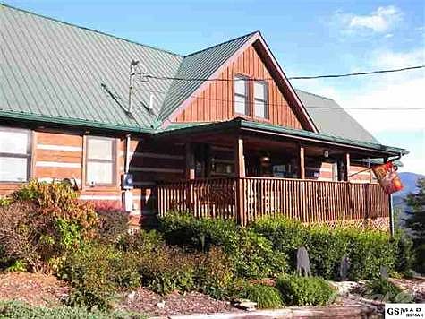 True log cabin with magnificent views and sits atop Bluff Mountain. This home is perfect for entertaining, a second home or placed on a rental program. There are two king size master suites on the main level, both featuring a whirlpool tub area separate from the bath area and a laundry room off of the main master suite. Both bedrooms feature patio doors leading to the deck to enjoy the view for miles. The main level also boasts a large living area with gas log stone fireplace and cathedrial ceiling with floor to ceiling windows. An oversize dining room and eat in kitchen with tons of cabinets and tile countertops. The upstairs boast a large bedroom, featuring 2 queen beds, a full bath with ceramic tile, a loft area and a gameroom with pool table, bar and flat screen tv. The upstairs bedroom and game room also have gas heaters installed as a backup heat source and the bedroom features a large closet. In additional to all of this there is also a finished workshop with a full kitchen and full bath in the basement. This space also offers a separate patio area for enjoying the magnificent views and a large 1 car garage and tons of storage space. This fantastic home is being sold fully furnished and is move in ready.