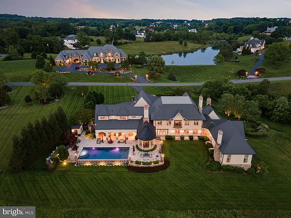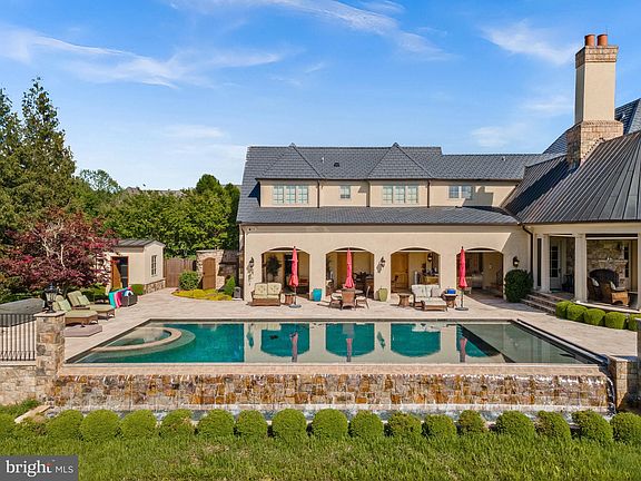 Imagine ending your day watching the most beautiful Loudoun County sunsets over the 7th hole of a Jack Nicklaus Signature Course—right from your private veranda! At Chateau Belvedere, a one-of-a-kind estate situated on 3 acres inside Leesburg’s exclusive Creighton Farms, that vision becomes your everyday reality. The home was designed and custom built by the renowned Galileo Signature, this tri-level residence is an architectural homage to English and French countryside manors, blending timeless elegance with modern craftsmanship over 14,000 sq ft of carefully curated interiors. From the moment you approach the grand drive, every detail impresses. Meticulous landscaping leads you towards the grand entrance. Inside, a floating curved staircase sweeps through the soaring foyer, illuminated by towering windows and anchored by curved walls that give the layout a fluid, gallery-like sophistication. A refined formal living room with bespoke cabinetry hosts intimate conversations, while beamed ceilings crown the family alcove with its wet bar and French doors leading out to the heart of the home: The Belvedere—an open air veranda commanding the best panoramic golf course views in the neighborhood. Culinary dreams come alive in a kitchen designed for both performance and beauty, complete with professional-grade appliances, a central prep island, and walk-in pantry. The adjacent breakfast nook feels like a European café, while the adjoining sunroom and heated patio each invite year-round entertaining. Your main-level primary wing offers a private luxury retreat complete with tray ceilings, fireplace, and a spa-inspired ensuite. Upstairs, all four secondary suites have accompanying baths and ample storage. Flexible living zones and a bonus kitchenette make this floor ideal for hosting or extended stays. A convenient elevator links all three levels, including a basement that rivals any resort: wine cellar with tasting room, exercise room, full size stage for concerts or recitals, cinema-style theater room, and the cozy fireside recreational area. Step outside to enjoy the sweeping golf course views and the infinity edge pool with spa and fountain. The outdoor spaces are thoroughly appointed, offering a full kitchen, exterior shower, and multiple conversation areas provide the perfect setting for all events large and small. Rounding out the home is a 3 car garage and an additional detached 2 car garage complete with 2 full size vehicle lifts. Car enthusiasts can easily store up to 7 vehicles indoors. The home also has a 1 year old Synthetic Slate Roof, Newer Geothermal Units and Commercial Whole House Generator. All of this and conveniently located near James Monroe Highway 15, Leesburg Airport, Washington Dulles Airport, and the Dulles Toll Road. Chateau Belvedere isn’t just a home—it’s a world unto itself. Come experience the intersection of luxury, leisure, and legacy!