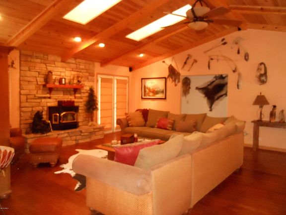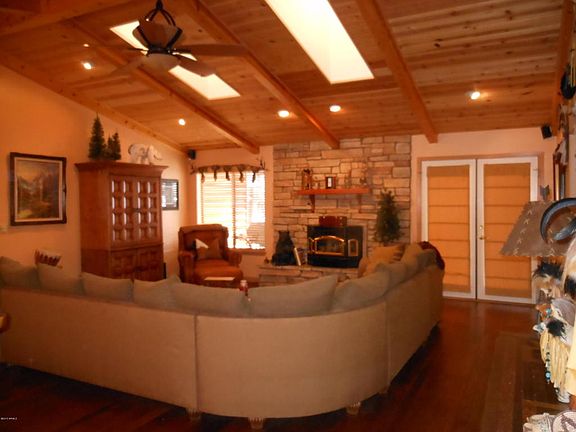 This Gorgeous Home is in the Heart of Pinetop in the Gated Community of Pineridge. The moment you walk into this home and enter the foyer, you see the Hand-Scraped Hardwood Cherry Flooring, the Massive Great Room with the Bricked Fireplace, the Tongue and Groove Ceiling, and the Dining Room. The adjourning Upgraded Kitchen has ''''All NEW'''' SS Appliances including a Sub-Zero Refrigerator, Copper Sink, tons of Cabinetry and Slate Flooring. There is a room off the Master Bedroom that is currently used as a man-cave... however it can be converted to a home office with a separate entrance. The Massive Redwood Deck in back overlooks the huge partially fenced backyard with a view of Pine Lake. There''s a room under the home that is currently used as a workshop with electric, heat, cable and telepho