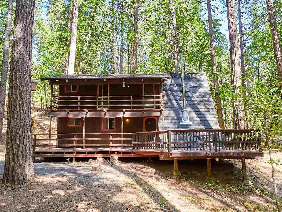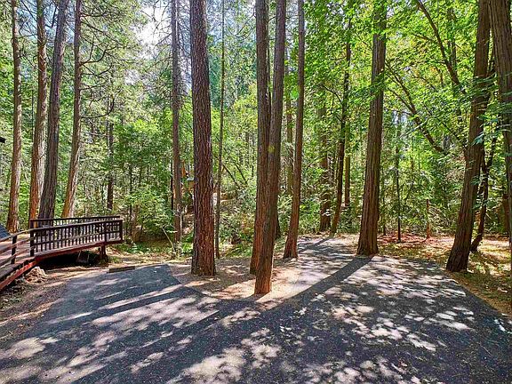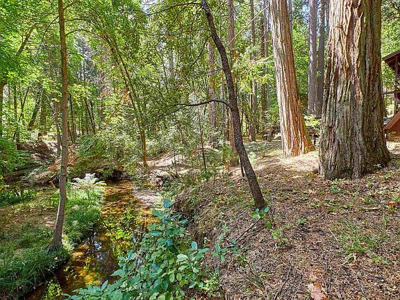 It's like walking into a storybook! Gorgeous stream-side setting and a darling cabin nestled privately and peacefully in the woods of Twain Harte on over half an acre. Pine and Oak trees surround the property on all sides, creating a glowing green filter around the home as the sun-rays shine through the leaves. Knotty pine interior and newer wood burning stove provide a classic homey feel, and large windows in the living room offer a lovely view of the private mountain setting. I would love to have morning coffee on the upper balcony and outdoor meals on the large lower deck at this cabin. Very spacious with 1513 sqft of floor space when you include the areas that are usable with the vaulted ceilings upstairs. There is a main level bedroom, huge loft bedroom and a private upper level master with balcony deck access. This place is clean and ready for your enjoyment! Great Parking with newer asphalt driveway and parking pad. The HOA includes 2 great community lakes, one of which is in walking distance! Horse stables are available along with riding lessons for the kids and there's a community clubhouse for parties. This would make an awesome vacation rental or residence!!