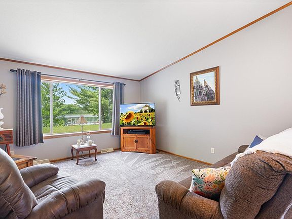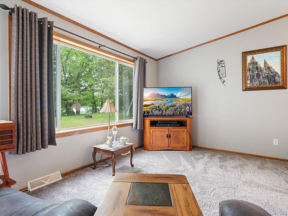 Pride of ownership shine through in this 3 bedroom rambler style home with all living facilities on one level. Situated on .84 acre lot with 101 ft of lake frontage on private elbow lake. Open floor plan. Walk in from the sliding glass doors to your eat-in kitchen with tons of oak cabinets, great counter space a center island and pantry closet. Open to the vaulted living room with tons of natural sunlight and panoramic views of the lake. Gas fireplace with oak mantel and new carpet.